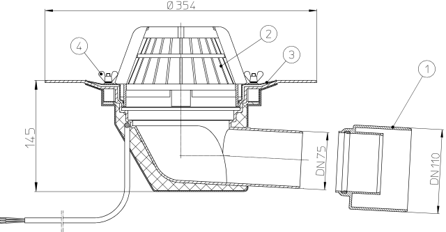 Воронка для плоских кровель горизонтальный выпуск с электроподогревом от сети напряжением 230В, мощностью 10-30Вт, с обжимным фланцем и зажимным из нержавеющей стали для прикрепления уплотнительных пленок, с листвоуловителем d 180 мм. Строительная защита во время монтажа в комплекте.