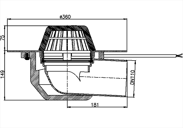 Кровельная воронка DN110, горизонтальный выпуск, с теплоизоляцией, с электрообогревом от сети напряжением 230В, мощностью 10-30Вт, с ПП-фланцем для приварки кровельного изолирующего полотна FPO (эластичный полиолефин) на основе ПП, с листвоуловителем d 180 мм. Строительная заглушка в комплекте.