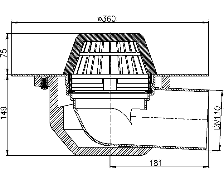 Кровельная воронка, горизонтальный выпуск, с теплоизоляцией, с ПП-фланцем для приварки кровельного изолирующего полотна FPO (эластичный полиолефин) на основе ПП, с листвоуловителем d 180 мм. Строительная заглушка в комплекте.