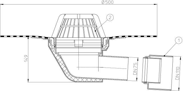 Воронка для плоских кровель горизонтальный с теплоизоляцией, с приваренным битумным полотном d 500 мм, в качестве идеального соединения к битумным кровельным уплотнениям, с листвоуловителем d 180 мм. Строительная защита во время монтажа в комплекте.