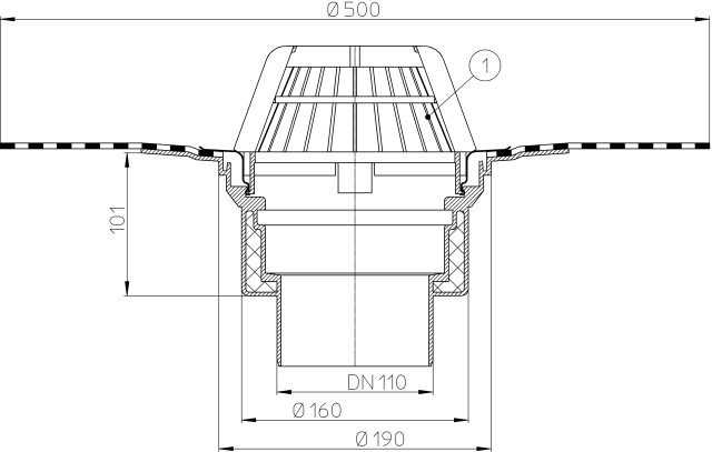 Воронка для плоских кровель вертикальный выпуск с теплоизоляцией, с приваренным битумным полотном d 500 мм, в качестве идеального соединения к битумным кровельным уплотнениям, с листвоуловителем d 180 мм.