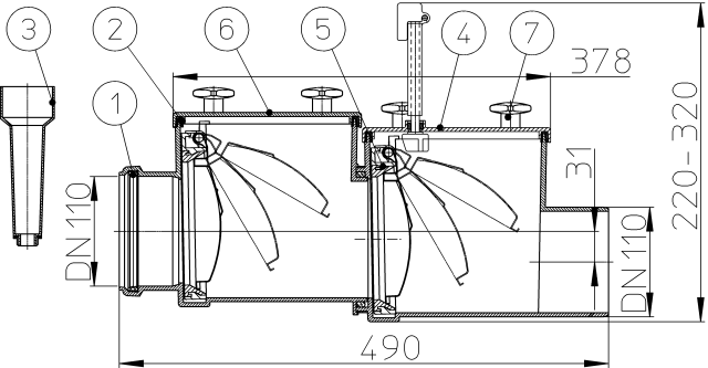 Механический магистральный канализационный затвор DN110 с двумя автоматическими заслонками из нержавеющей стали, ручным затвором и прочисткой.