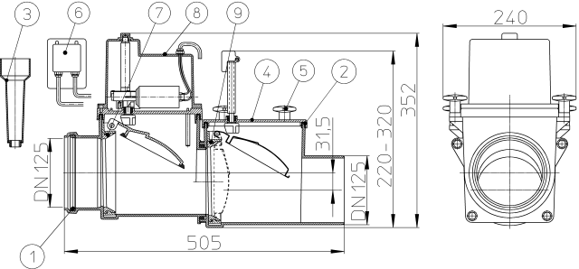 Механический магистральный канализационный затвор DN125 с электроприводной заслонкой, ручным затвором и прочисткой. Показ работоспособности, показ и звуковой сигнал на электронном модуле управления при повреждении. С возможностью подключения к компьютеру.