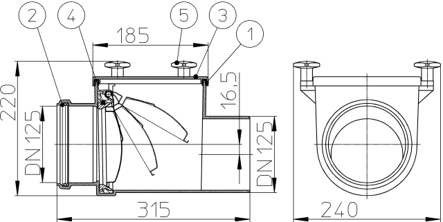 Механический магистральный канализационный затвор DN125 с автоматической заслонкой из нержавеющей стали и прочисткой.