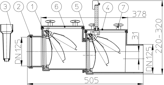 Механический магистральный канализационный затвор DN110 с двумя автоматическими заслонками из нержавеющей стали, ручным затвором и прочисткой.