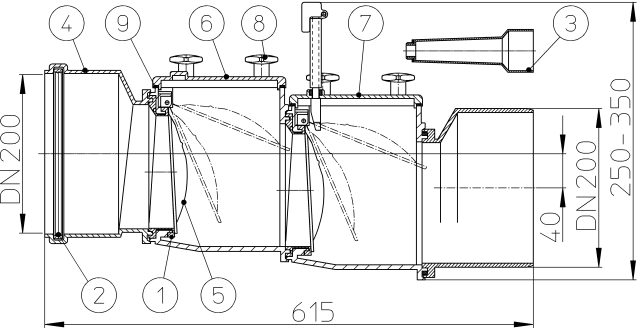 Канализационный затвор DN200 с двумя автоматическими заслонками из нержавеющей стали, ручным затвором и прочисткой.