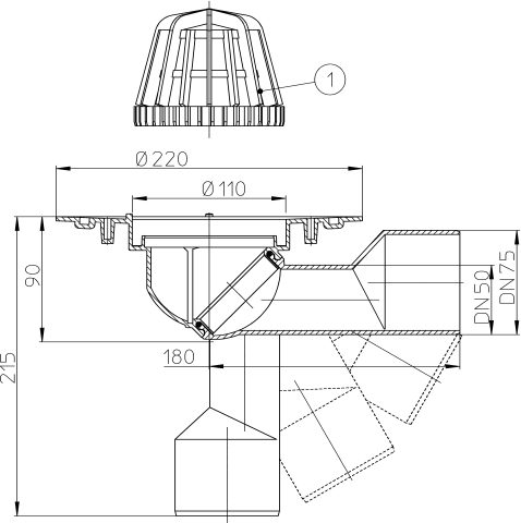 Воронка для плоской кровли DN50/75 с обжимным фланцем, выпуск с бесступенчатой настройкой (горизонтальный - вертикальный), листвоуловителем d 110мм. Строительная защита во время монтажа в комплекте.
