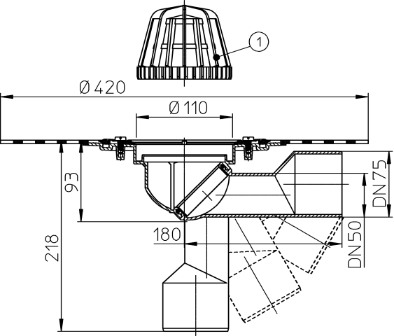 Воронка для плоской кровли DN50/75 с приварным битумным полотном d 420мм, выпуск с бесступенчатой настройкой (горизонтальный - вертикальный), листвоуловителем d 110мм. Строительная защита во время монтажа в комплекте