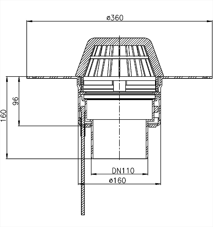 Кровельная воронка для плоской кровли с вертикальным выпуском, с теплоизолирующим корпусом, с электроподогревом (прямое подключение к сети 230В), осуществляемый саморегулирующимся кабелем, меняющим свою теплоотдачу в зависимости от температуры воздуха, с ПВХ-консолью для приваривания ПВХ-полотна и с листвоуловителем d 180 мм. Строительная защита во время монтажа в комплекте