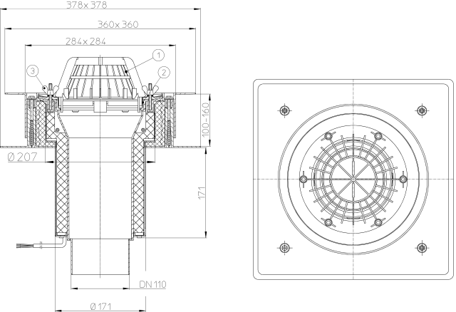 Воронка для плоских кровель DrainBox вертикальный выпуск с теплоизолируемым и с регулируемой высотой корпусом трапа с электроподогревом от сети напряжением 230В, можностью 10-30Вт для установки теплоизоляции 100 - 160 мм, с зажимным фланцем из нержавеющей стали для прикрепления уплотнительных пленок, с листвоуловителем d 180 мм. Строительная защита во время монтажа в комплекте.