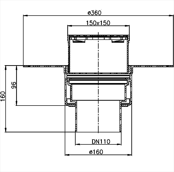 Кровельная воронка для эксплуатируемой кровли, вертикальный выпуск, с теплоизоляцией, с ПП-фланцем для приварки кровельного изолирующего полотна FPO (эластичный полиолефин) на основе ПП, с надставным элементом 20-75 мм (подрамник 148 х 148 мм/решётка из нержавеющей стали 137 х 137 мм). Строительная заглушка в комплекте.